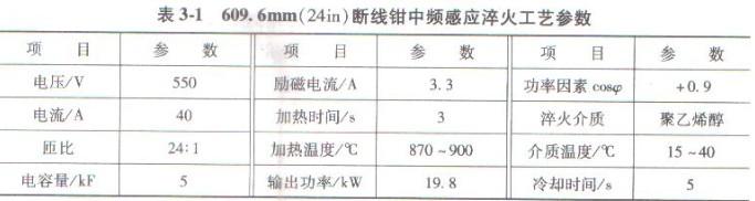 斷線鉗刀片是用GCr15鋼制造,刀口硬度要求55 -60HRC,其余部分的硬度為33~40HRC。刀片生產(chǎn)工藝流程為:鍛造成形一正火一球化退火一機械加工一調(diào)質(zhì)一中頻感應(yīng)淬火一低溫回火一磨刃一裝配。采用BPD100/8000型變頻機和DGF一C一108一2型中頻淬火控制設(shè)備。609.6mm(24in)斷線鉗中頻感應(yīng)淬火工藝參數(shù)如表3-1所示。